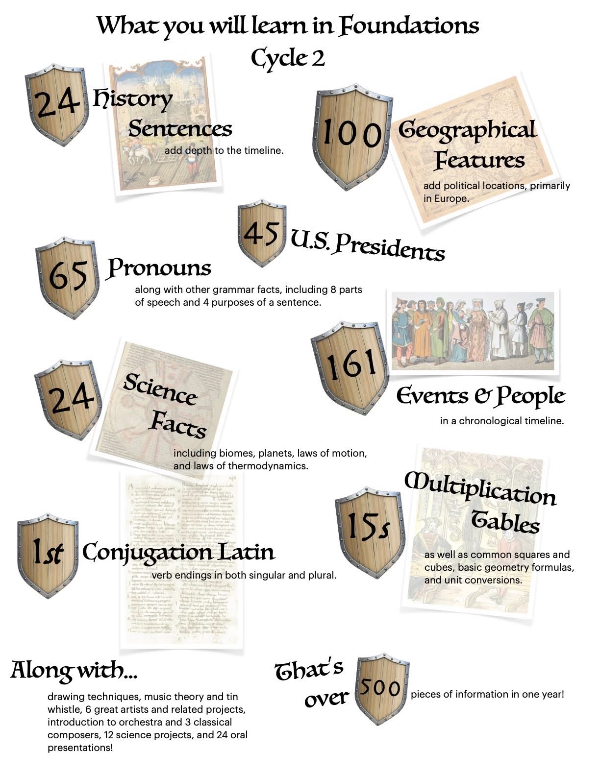 In Classical Conversations Foundations Cycle 2, the focus is on the medieval world through the modern era, with memory work that highlights the growth of nations, scientific discovery, and artistic expression.